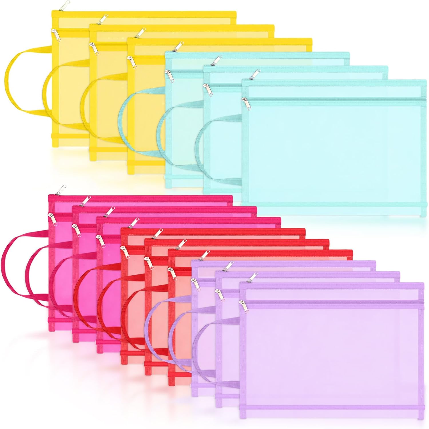 - Packing Include: you will get 15 pcs mesh zipper bags with handles, there are 5 colors, include light purple, deep lake blue, watermelon red, yellow, rose red, 3 pieces of each color; The size of the clear mesh bag is about 13.19 x 9.25 x 0.2 inches/ 33.5 x 23.5 x 0.5 cm, suitable for storing some building blocks, puzzles, or other small toys, and can be stacked without taking up too much storage space