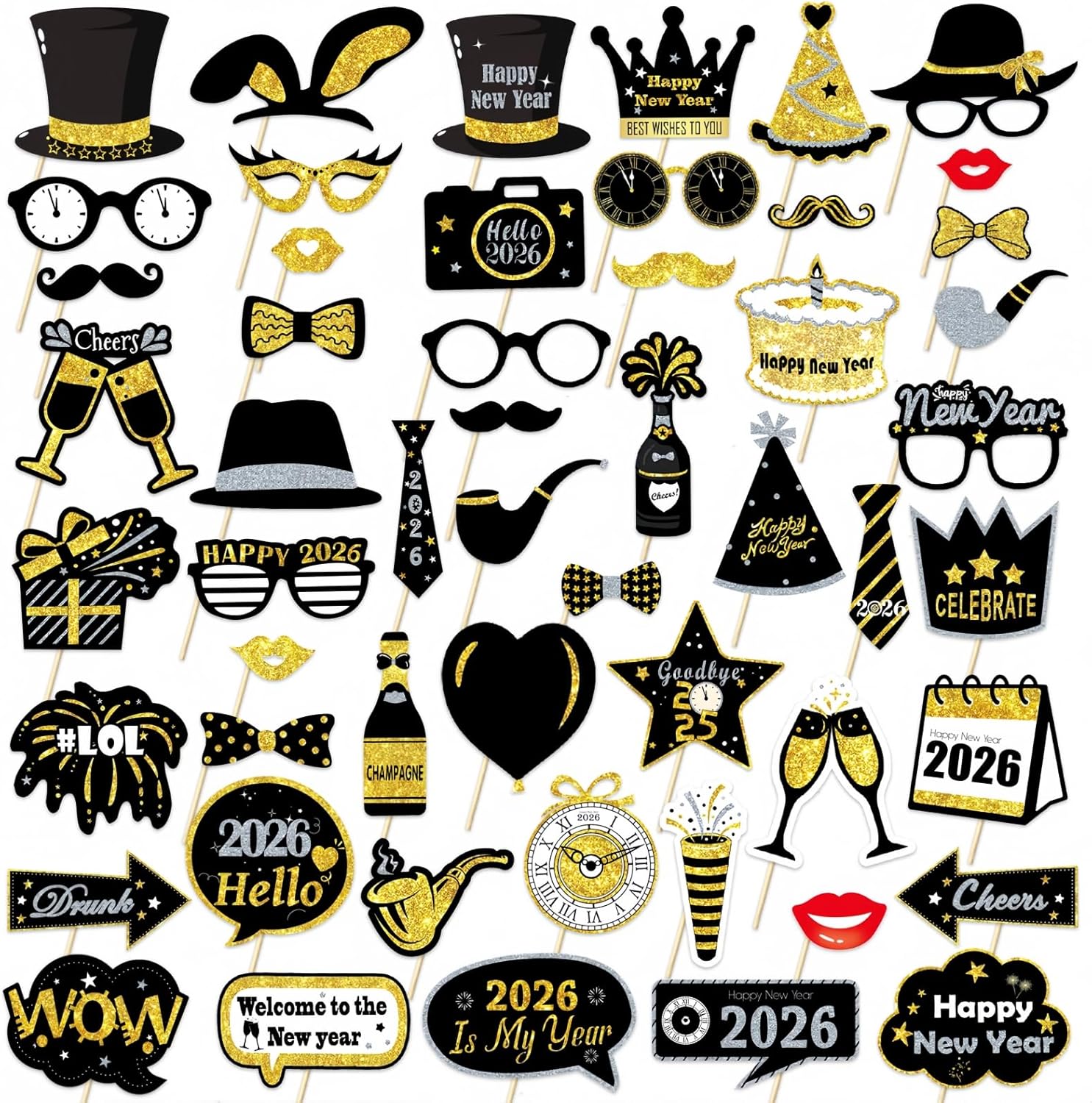 - Package including: 53 glitter happy new year 2026 photo booth props, 53 wooden sticks, 53 double-sided adhesives. The new year props 2026 bring joy to your holiday and make your new year party look unique and exquisite