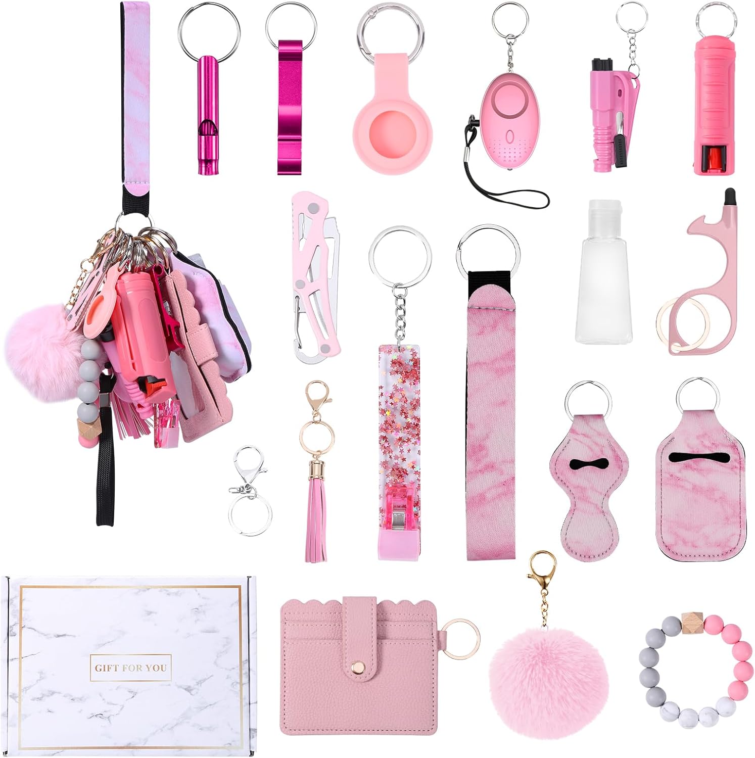 Safety Keychain Set for Women with Personal Alarm, Pom Pom, Card Wallet, Bottle Opener, Bracelet Wristlet Keyring