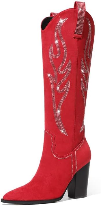 Celbreez Cowboy Boots for Women Cowgirl Boots Women Suede Knee High Boots Rhinestones Embroidered Western Boots Pointed Toe Chunky Heel Side Zip Festival Country Concert Shoes
