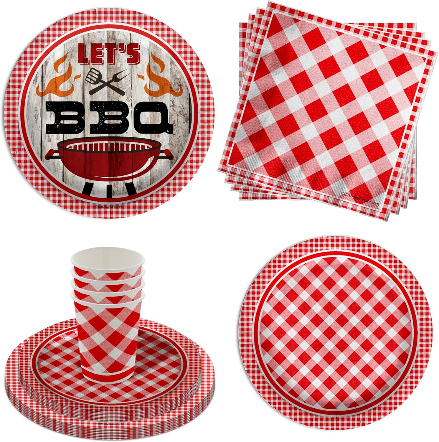 Let's BBQ Red Gingham Birthday Party Supplies - 64 Piece Summer Barbeque Picnic Tableware Set Includes Large 9" Dinner Plates and 8" Dessert Paper Plates Napkins Cups - Kit for 16