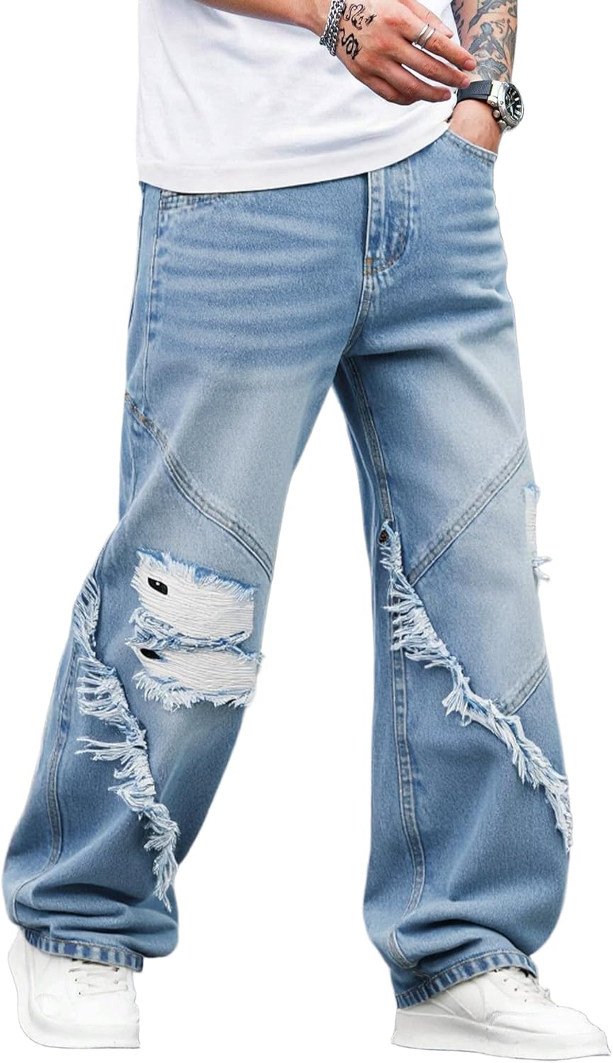 Mens Ripped Jeans Relaxed Fit Straight Leg Y2K Denim Pants Hip hop Streetwear Trousers