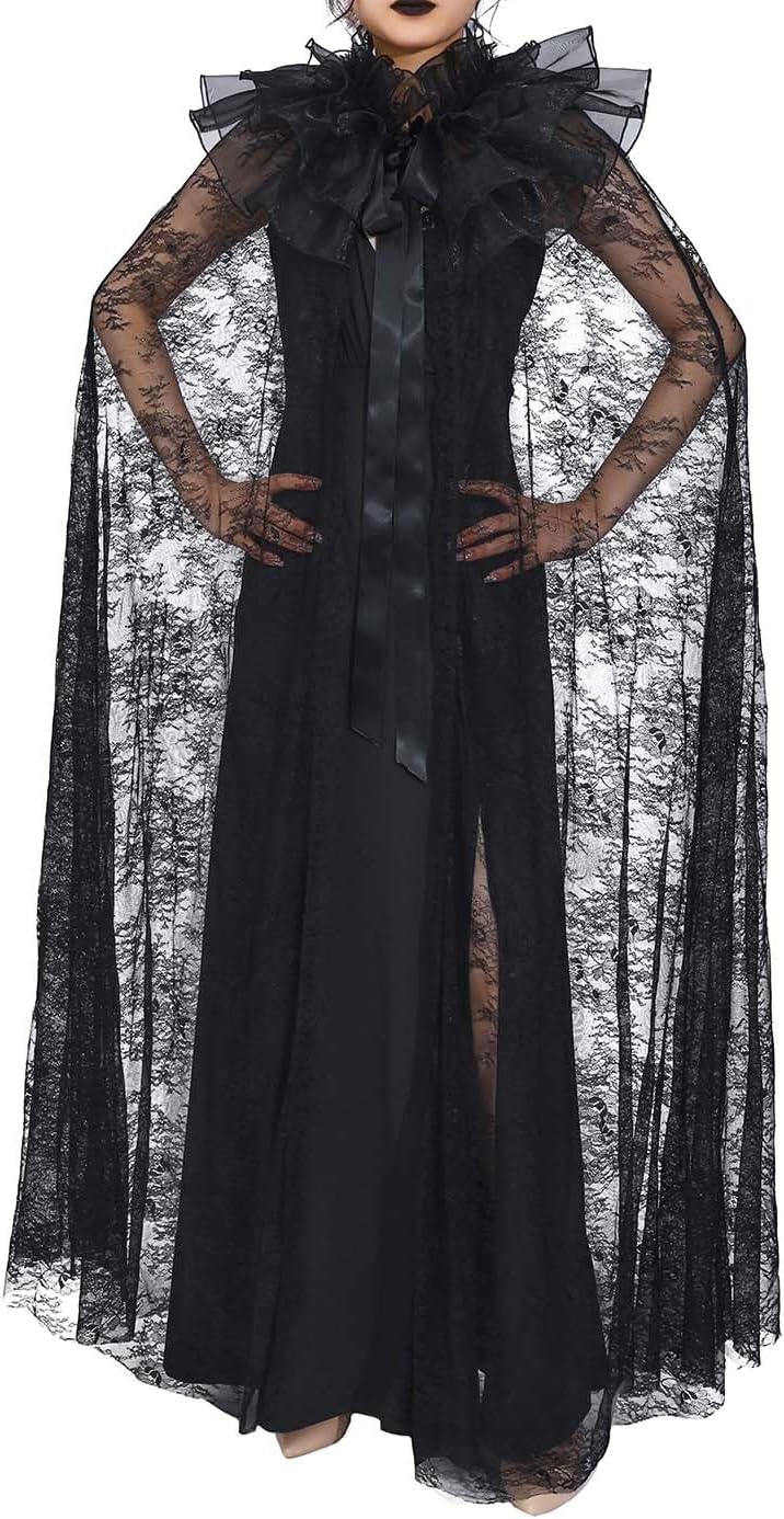 EASEDAILY Black Lace Cape Gothic Cloak Witch Halloween Costume Cosplay Capelet Long Robe for Women and Girls