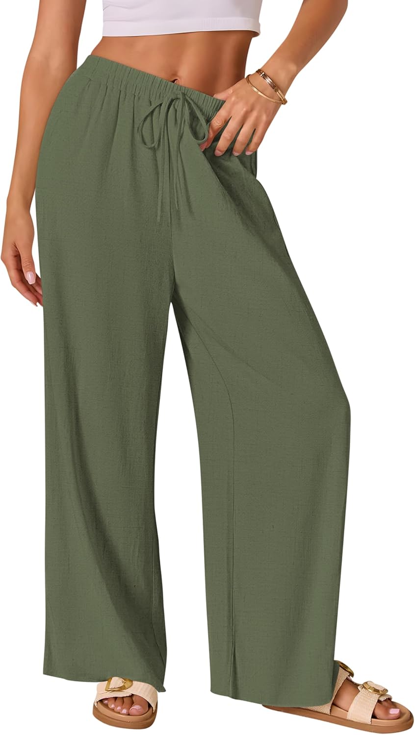 AISEW Women's Cotton Linen Palazzo Pants Drawstring Elastic Waist Casual Wide Leg Long Lounge Trousers with Pockets