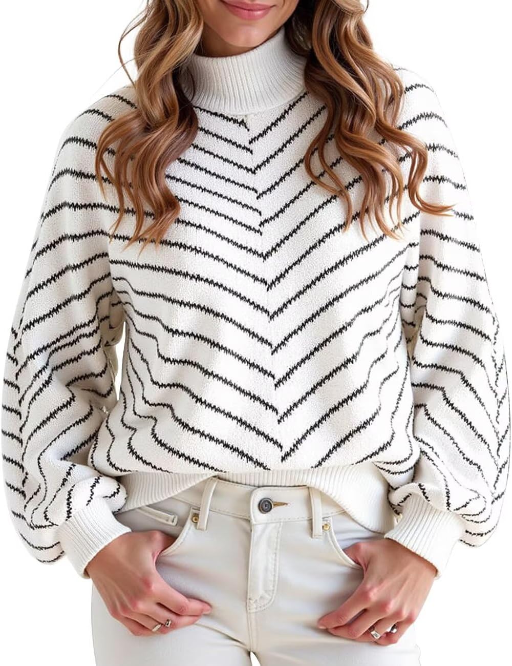 Upopby Women's Striped Fall Winter Sweaters for Women Trendy Turtleneck Lantern Sleeve Knitted Pullover Sweater Jumper Tops