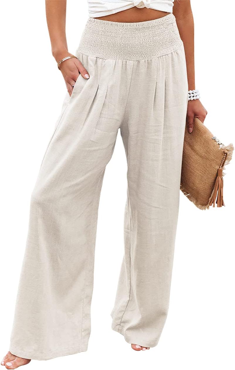 chouyatou Women's Smocked High Waisted Cotton Linen Wide Leg Pants Palazzo with Pockets