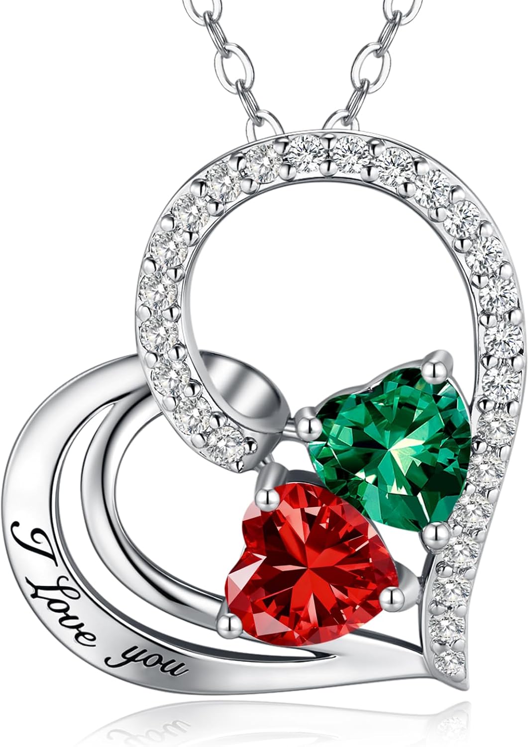 Double Birthstone Heart Necklace 0.8CT Dual-Gemstone S925 Sterling Silver Plated White Gold Engraved I Love You Perfect Anniversary/Valentine's Day Gift for Wife/Girlfriend/Mom/Daughter