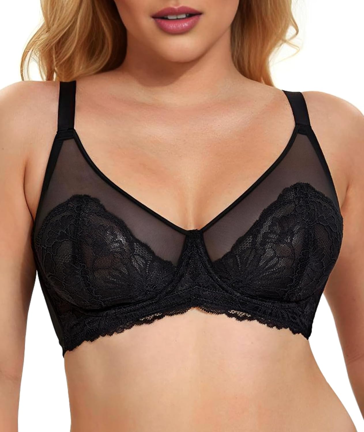 Womens Minimizer Bra Full Coverage Unlined Underwire Support Floral Lace Bralette with Mesh Cups Plus Size Bras