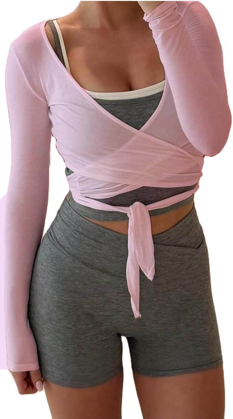 Women Y2k Long Sleeve Wrap Crop Top Ballet Pilates Workout Yoga Tie Front Shirts V Neck Slim Fit Wrap Corset Tops
