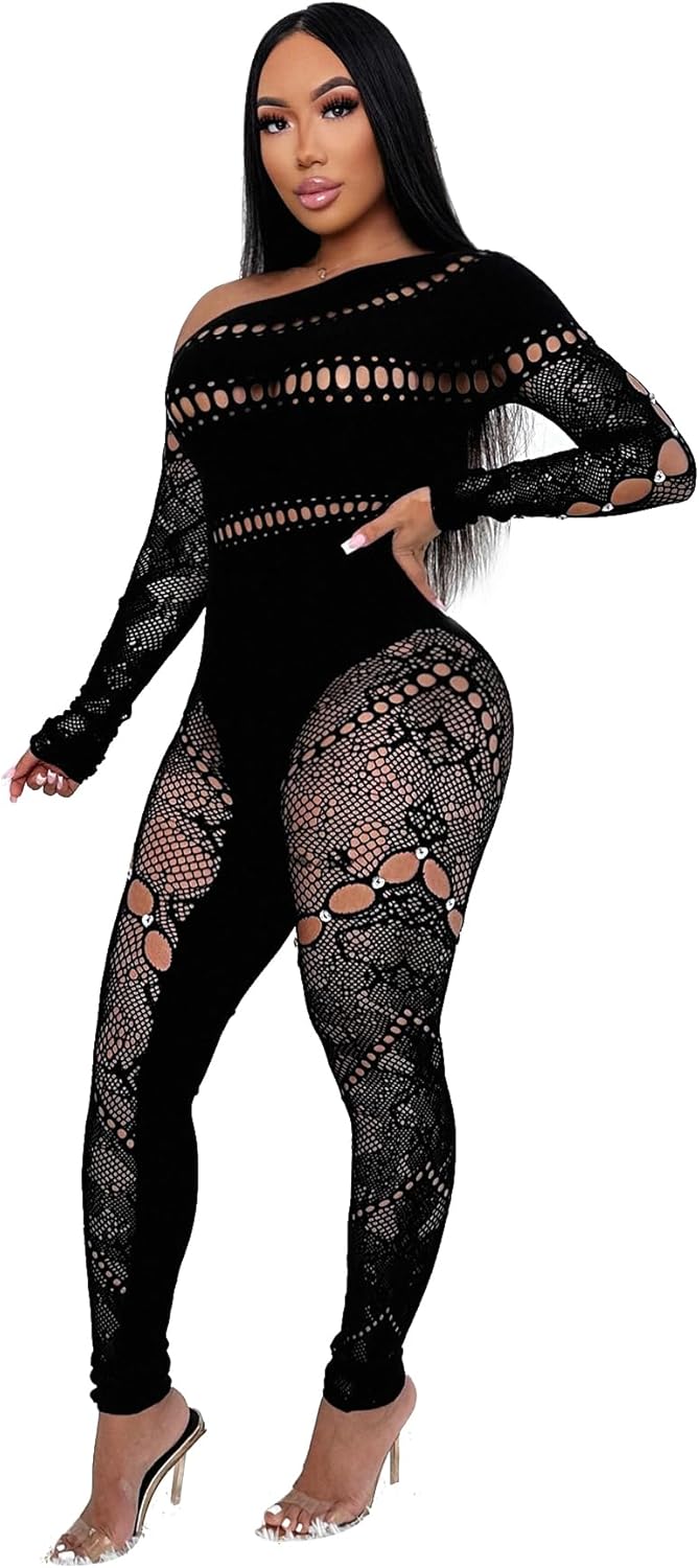 One Shoulder Mesh Cutout Jumpsuit, Long Sleeve, Black Lace Pattern, Club Party Wear