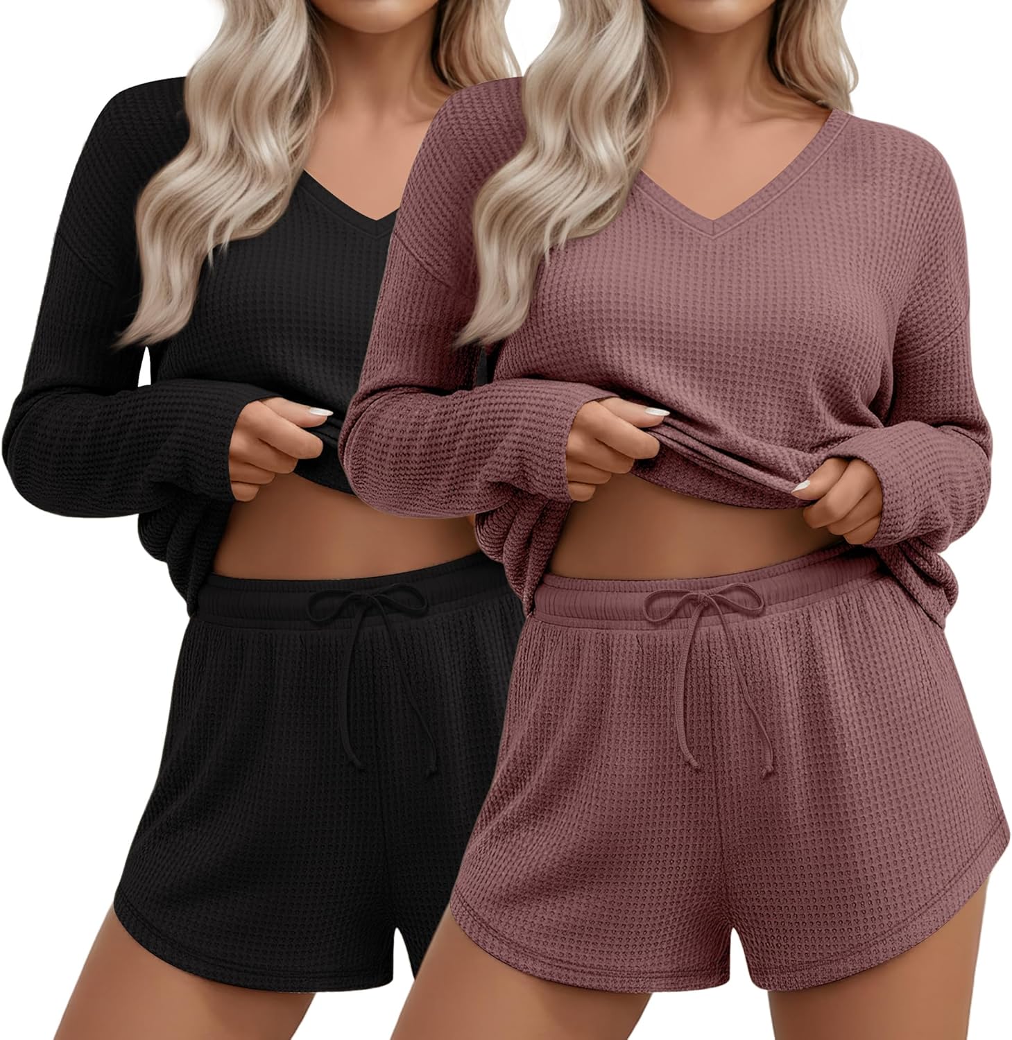 2 Pack Women's Waffle Knit Lounge Sets Long Sleeve V Neck Pajama Sets Tops and Shorts Loungewear with Pockets