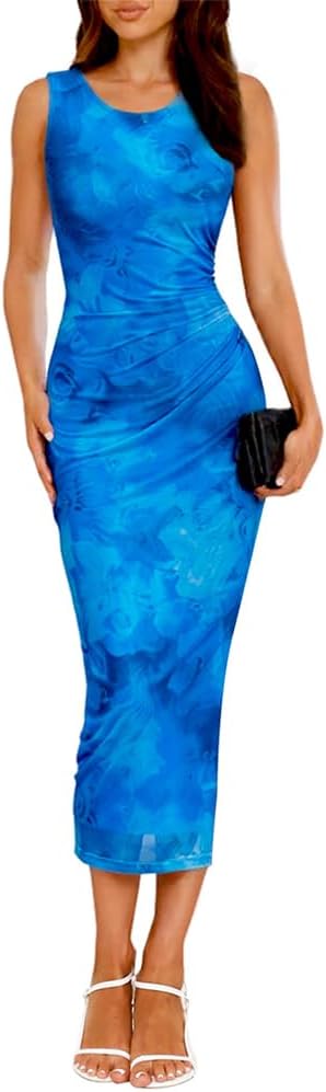 oten Women's Sleeveless Mesh Floral Summer 2025 Ruched Bodycon Slit Wedding Guest Cocktail Party Midi Dress