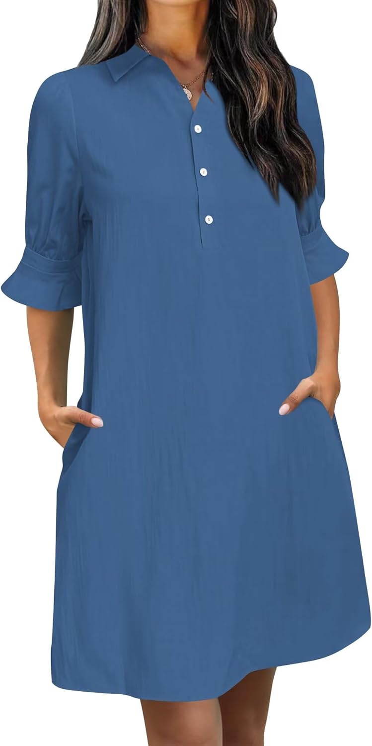 Wkior Women's Casual Shirt Dress Button Down Ruffle Sleeve Shift Summer Mini Dresses with Pockets Dusty Blue L