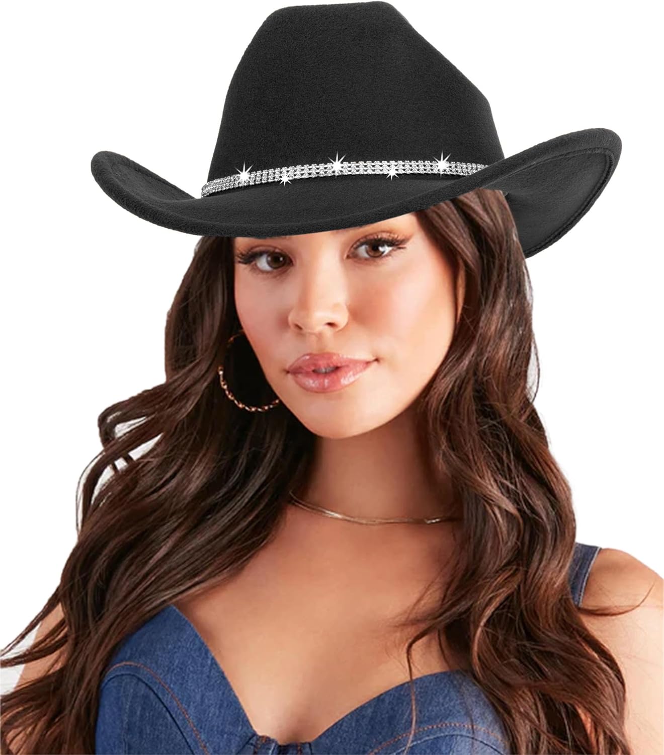 Women-Rhinestone-Western-Cowboy-Hats - Vintage-Wide-Brim-Cowgirls-Hat Bling-Diamond-Hat for Disco Music Party M/L