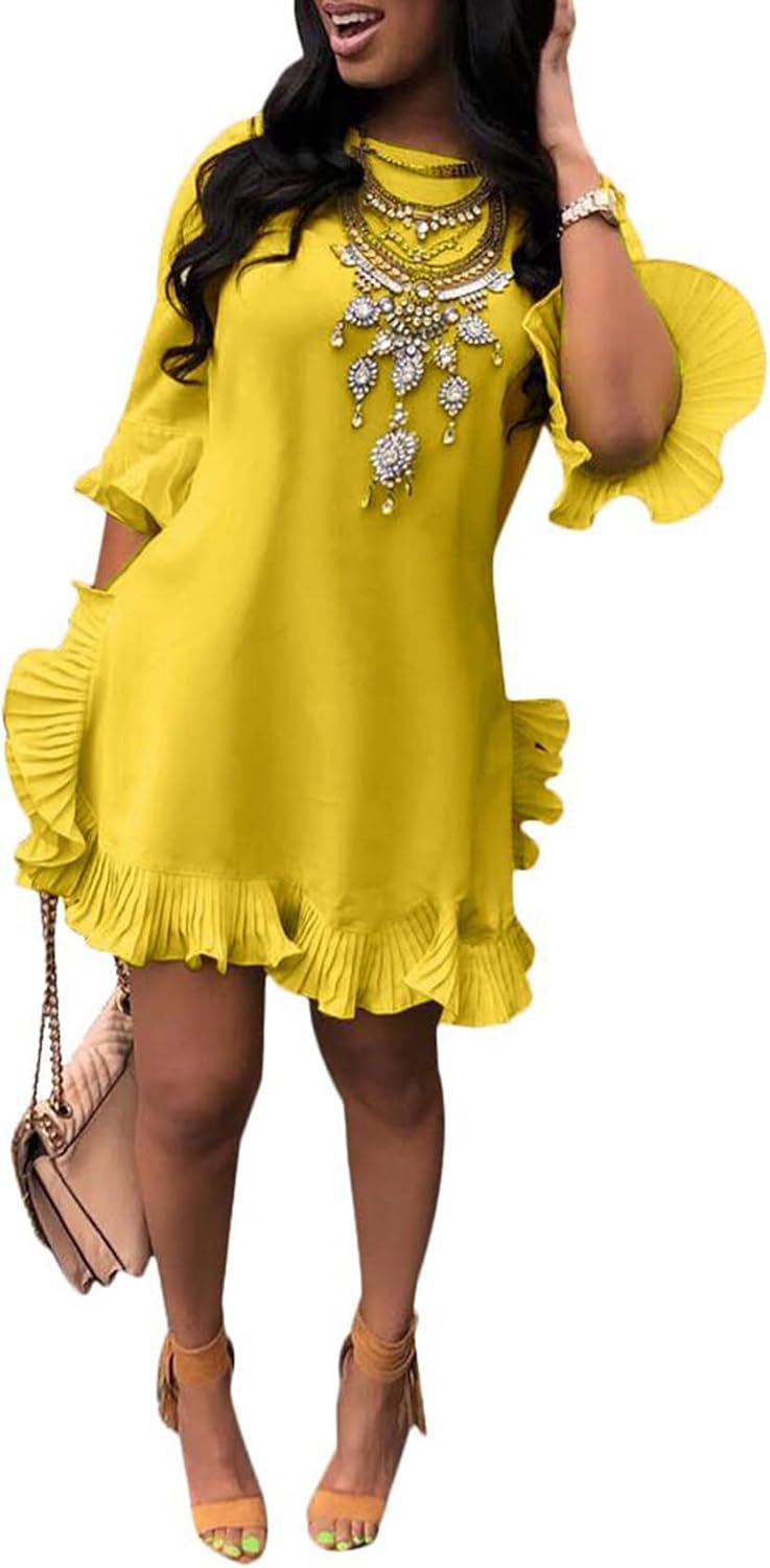 LKOUS Women Short Sleeve Round Neck Ruffles Hem Loose Midi Dresses Casual Short Dress