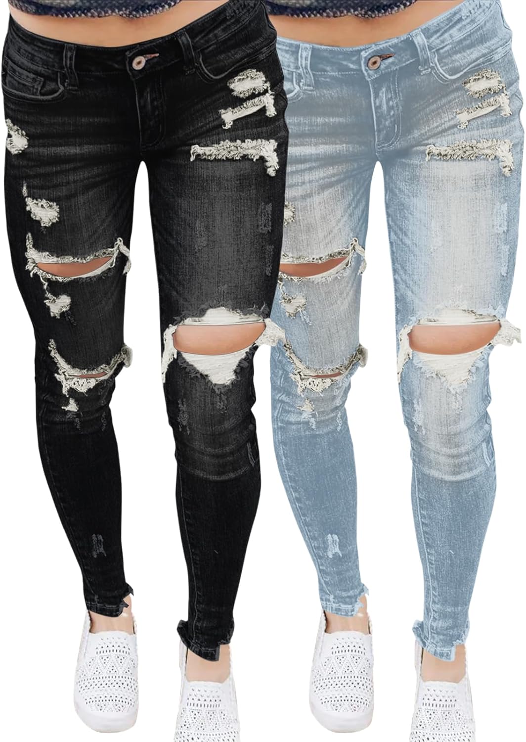 PerZeal Mid Waisted Jeans for Women 2 Piece Stretch Skinny Destroyed Ripped Distressed Denim PantsBlack&Light Blue Small