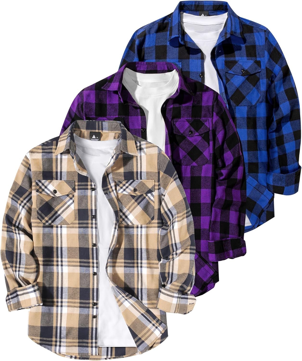 GEEK LIGHTING 3 Pack Flannel Shirt for Men Western Shirts Casual Button Down Shirt Long Sleeve Plaid Shirts with 2 Pockets
