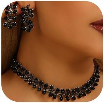 Vintage Black 1920s Faux Pearls Choker Earrings Jewelry Set Circle Necklace Earrings Set Bohemian Black Pearl Short Layered Choker Necklace Halloween Necklace Earrings for Women