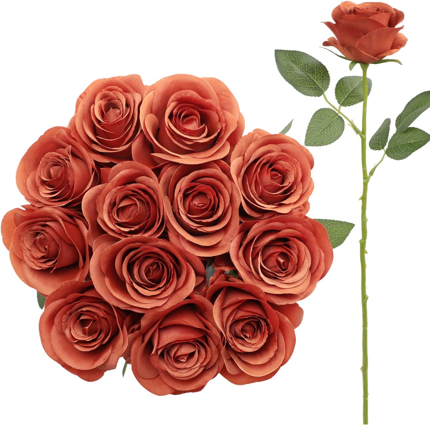 12pcs Roses Artificial Flowers Burnt Orange Fake Roses Flowers with Long Stems Silk Flowers for Wedding Bouquet Centerpices Decorations Party Bridal Baby Shower Home Decor