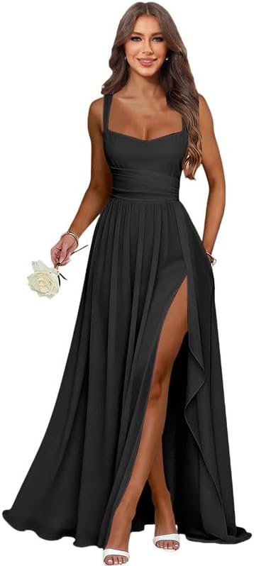 Chiffon Bridesmaid Dresses for Women Spaghetti Straps Square Neck Formal Dresses High Slit Evening Party Gown