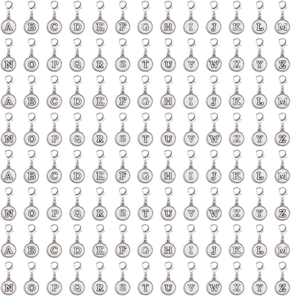SUPERFINDINGS 104Pcs 26 Letter Charms Clip On Charm Zipper Pulls Charms Alloy A to Z Alphabet Charm with Lobster Clasp Letter Antique Silver Decorations for Keychain Purse Backpack Ornament