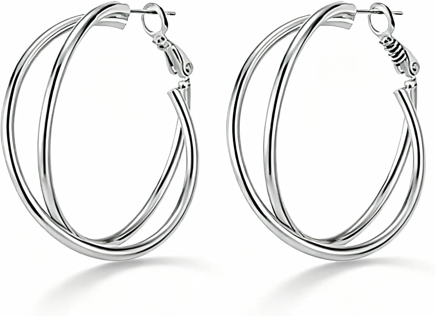 Double Layer Silver Hoop Earrings for Women 18K White Gold Plated 40mm Chunky Big Hoops Hypoallergenic 925 Sterling Silver Posts Nickel Free Lightweight Trendy Jewelry
