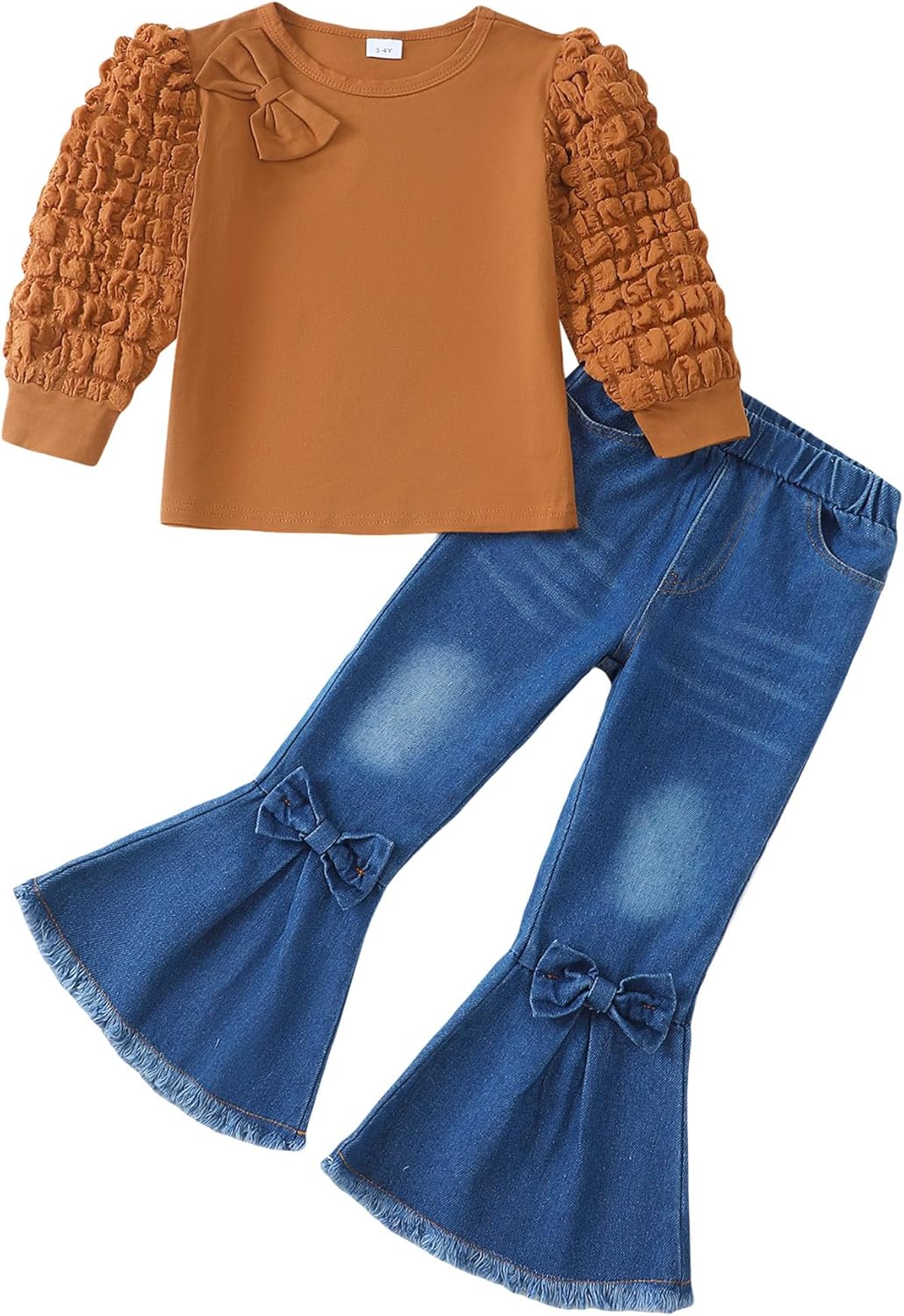 Kucnuzki Toddler Girl Clothes Cute Kids Clothes Long Sleeve Shirts Top Bell Bottom Denim Jeans Pants 2 Piece Matching Outfits