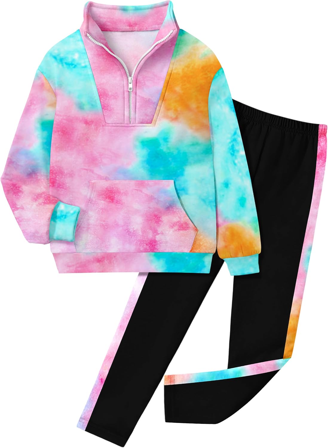 Girls Clothes Tie Dye Quarter-zip Sweatshirt + Camo Sweatpants Girls Clothing Sets 2 Piece Fall Winter Outfits 7-14T