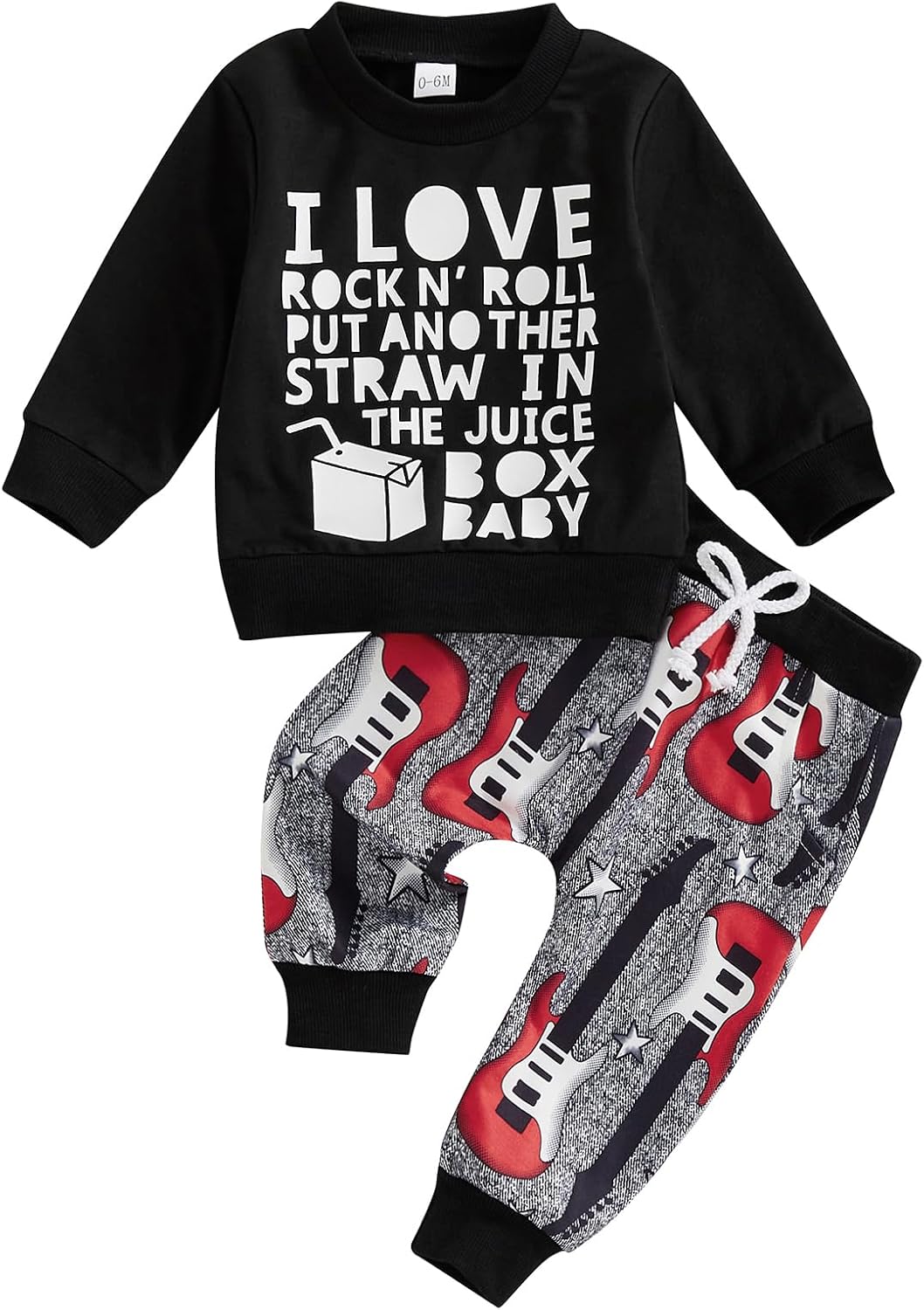 Karuedoo Toddler Baby Boy Clothes Letter Print Long Sleeve Sweatshirt Top Guitar Pants Set 2Pcs Fall Winter Outfit