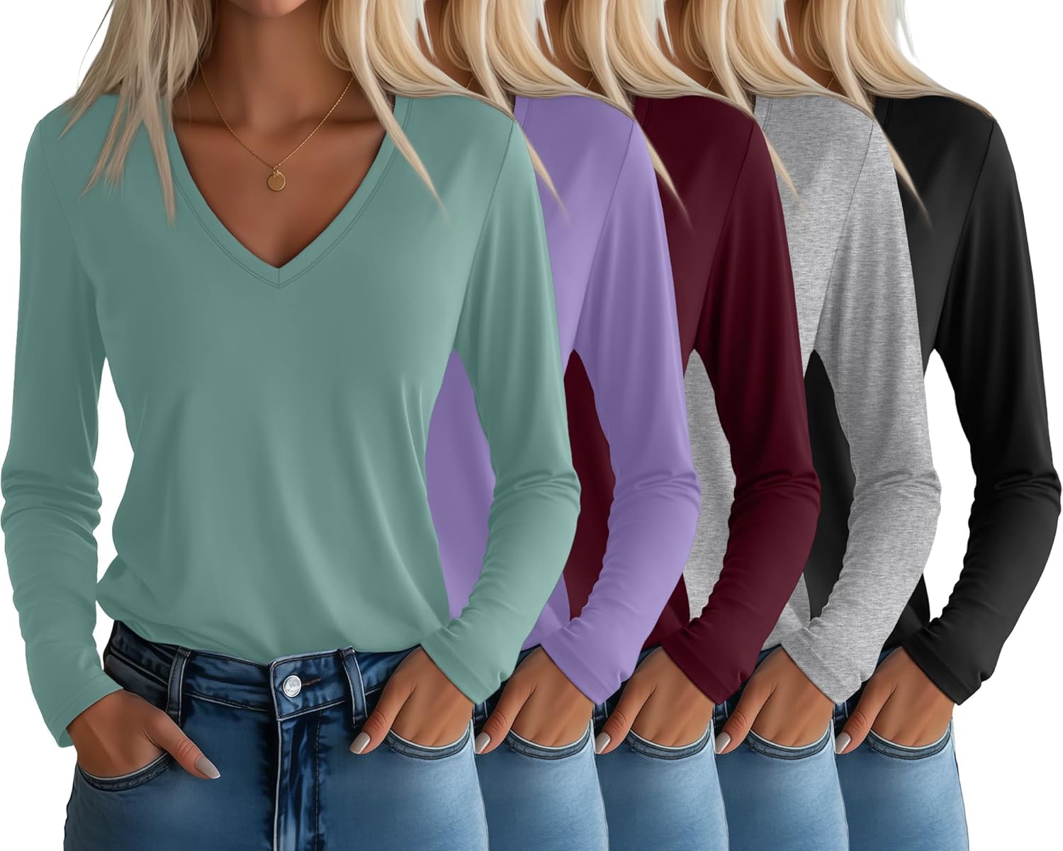 Huukeay 5 Pack Women's T-Shirts V Neck Long Sleeve Tops Casual Loose Fit Layering Shirts Flat Hem Basic Plain Work Tees