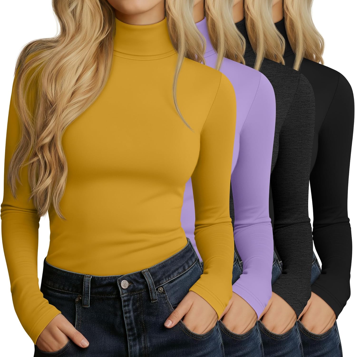 Huukeay 4 Packs Women's Turtleneck Tops Long Sleeve Shirts Mock Turtleneck Basic Tees Lightweight Slim Fit Casual Undershirt(Ginger Yellow, Purple, Dark Heathered Gray, Black,Large)