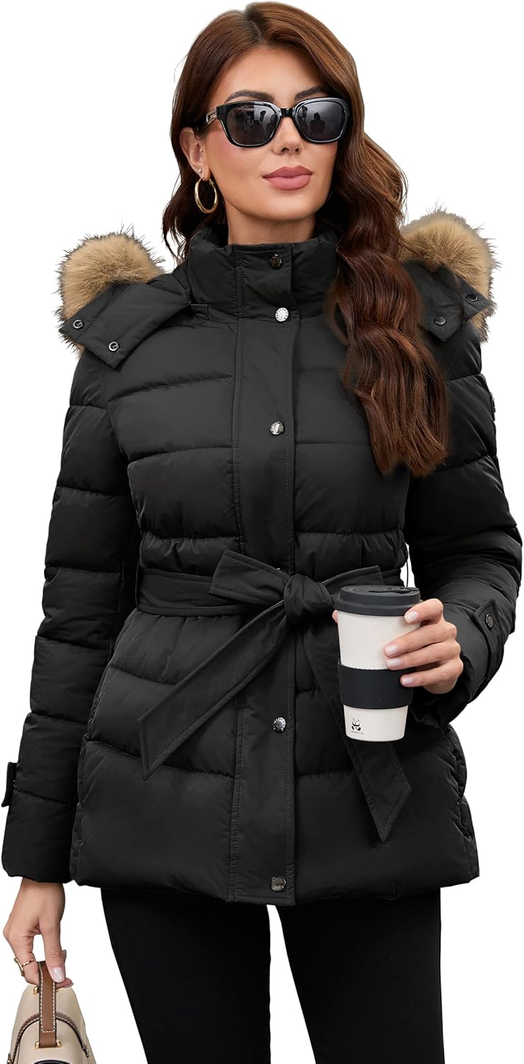 PAPILLON D'OR WEAR YOUR WINGS Women's Belted Mid-Length Puffer Coat - Detachable Faux Fur Collar Winter Jacket