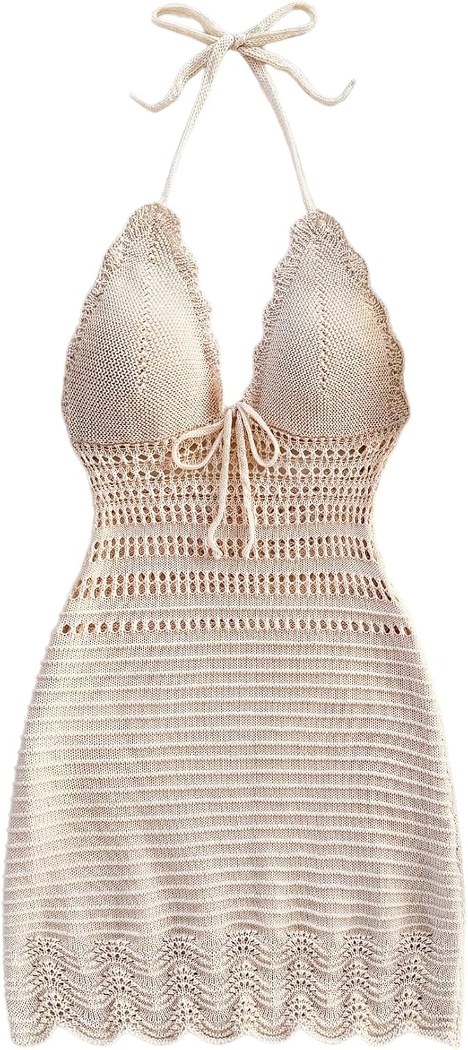 GORGLITTER Women's Crochet Halter Mini Dress Summer Vacation Outfits Bow Tie Backless Bodycon Knit Dresses Beach Sundress