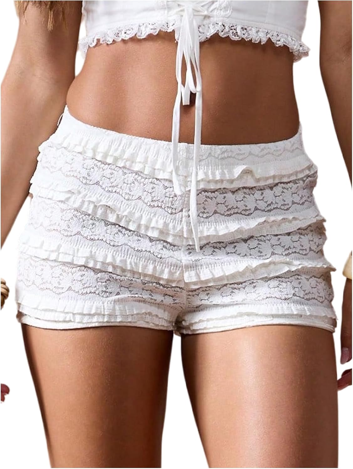 MakeMeChic Women's Ruffle Mini Shorts Crochet Layered Mesh Lace Micro Shorts