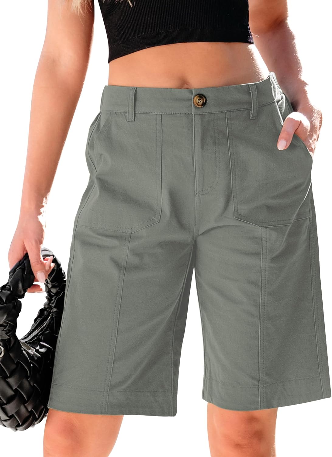 luvamia Bermuda Shorts for Women Knee Length High Waisted Cotton Elastic Waist Summer Dressy Casual Long Chino Shorts