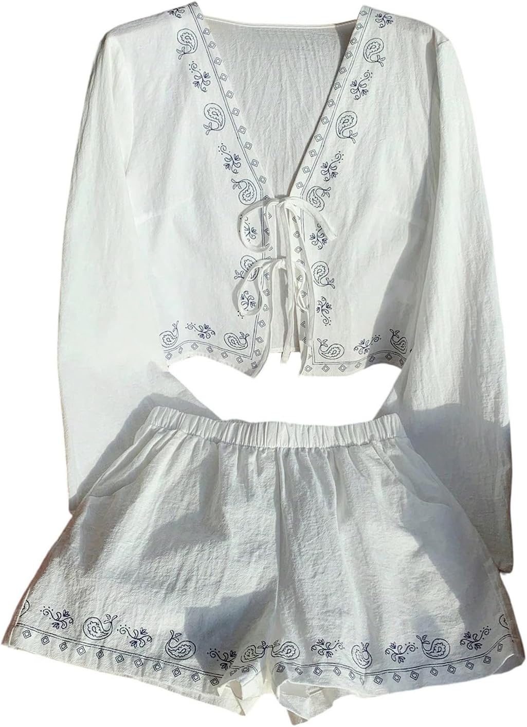 Verdusa Women's 2 Piece Boho Graphic Outfits Tie Front Long Sleeve Blouse and Shorts Clothing Sets