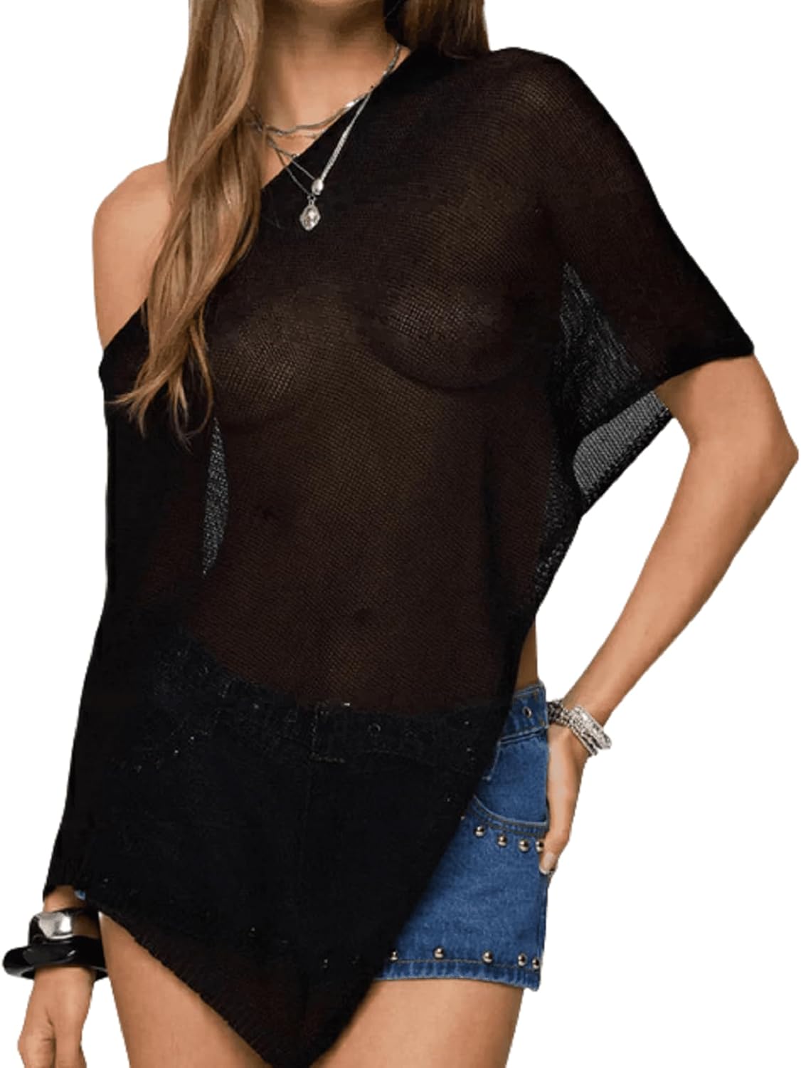Aonoapll Women Sheer Knit Poncho Off Shoulder Asymmetric Shrug Sweater Pullover Top See Through Cover Up Tops