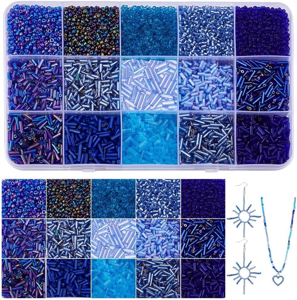 PH PandaHall 8000pcs 15 Colors Blue Series Glass Seed Beads 2mm Mini Round Glass Beads 3-8mm Bugle Bead Tube Spacer Bead for Summer Seaside Bracelets Necklaces Earrings Jewelry Making Weaving, 210g