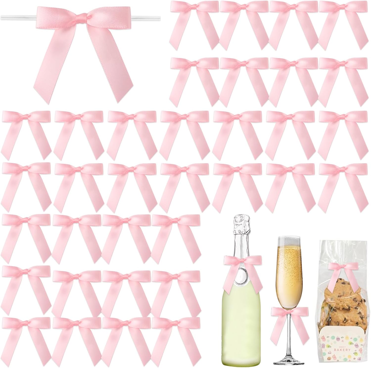 50 Pcs Pink Satin Ribbon Twist Tie Bows 2.76×2.95 inch – Premade Small Bows for Gift Wrapping Treat Bags Wedding Baby Shower Party Favor Decorations