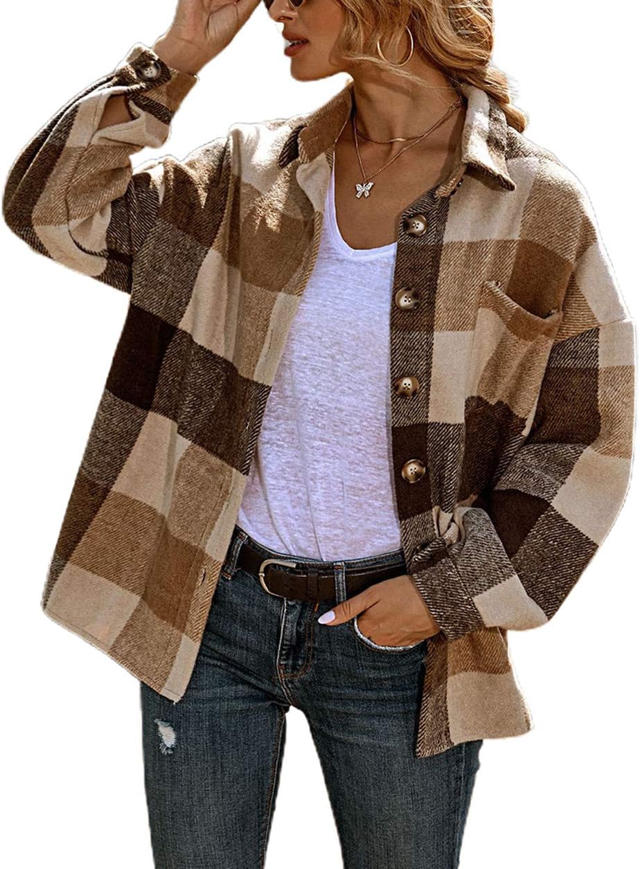 chouyatou Women's Oversized Casual Button Down Plaid Shirt Jacket Flannel Shacket