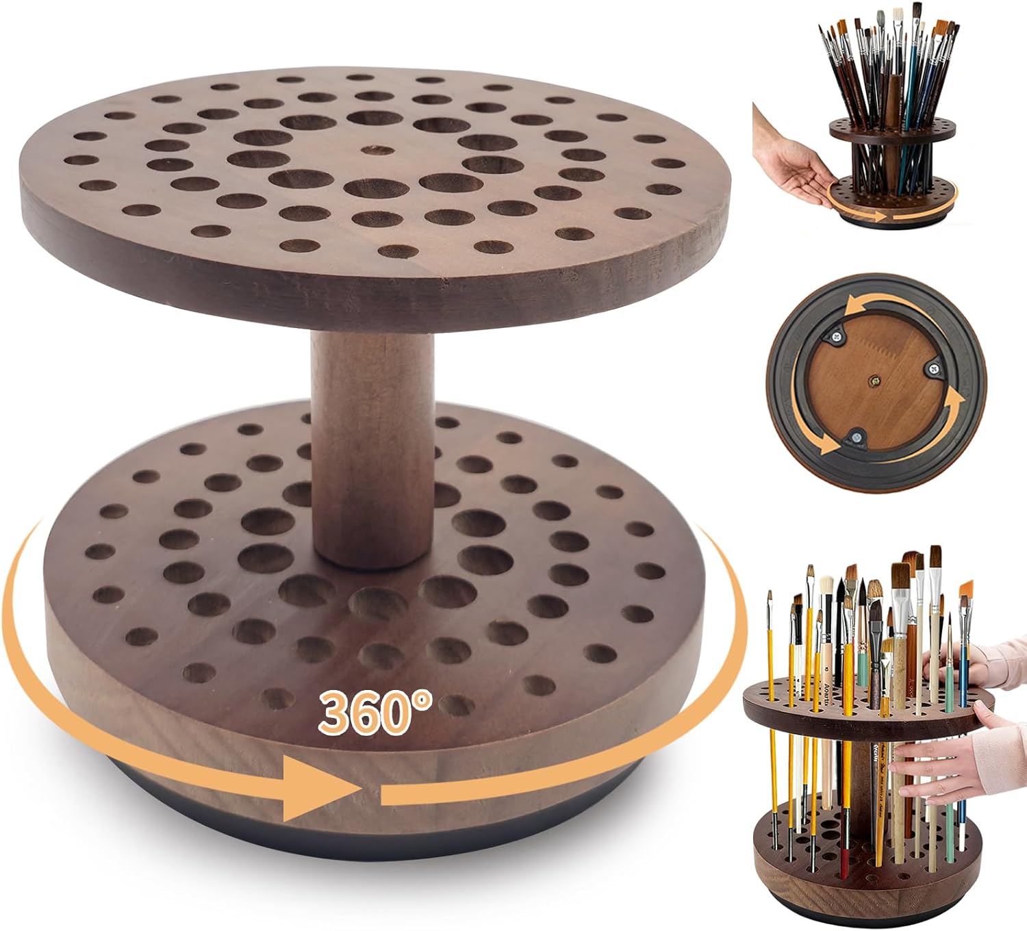 52-Hole Rotating Paint Brush Holder, 360° Smooth Spinning Artist Paint Brush Organizer and Storage, Hardwood Art Brush Drying Rack for Watercolor Brushes, Makeup Brushes & Calligraphy Pens