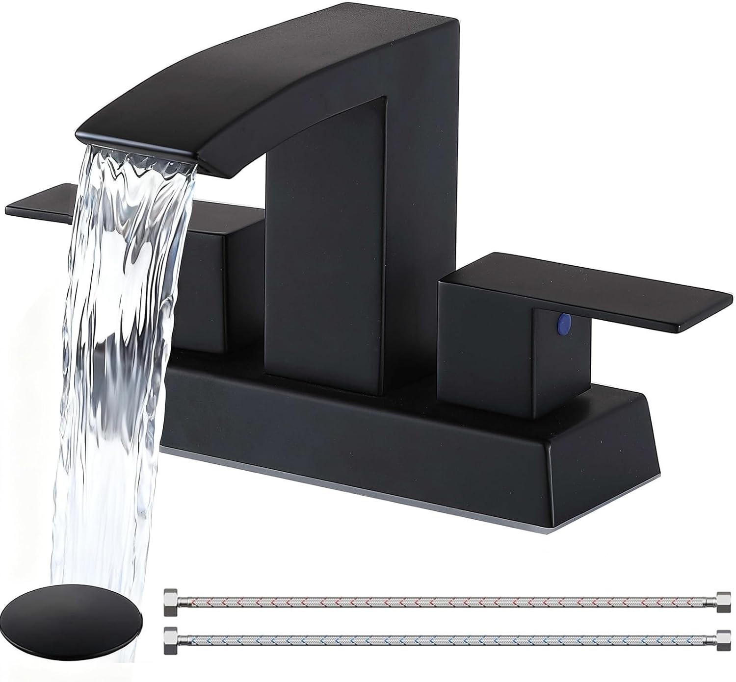 Friho Black Waterfall Bathroom Faucet, 4 Inch Centerset Bathroom Sink Faucets, 3 Hole 2 Handle with Square Spout, Pop up Drain and Water Hoses for Lavatory RV Vanity