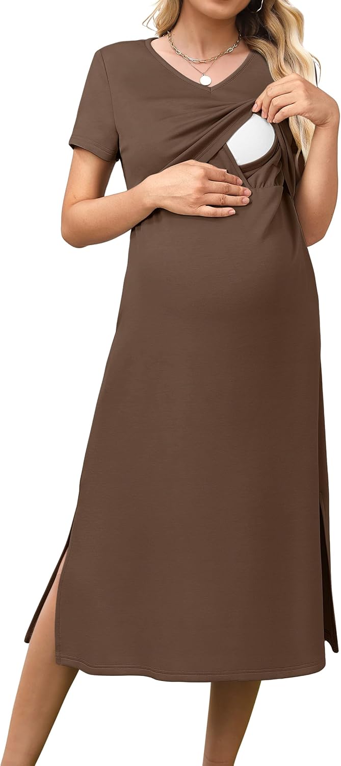 OUGES Womens 2025 Summer Short Sleeve Maternity Dress V Neck Split Long Midi Nursing Dresses Breastfeeding Casual Pregnancy Must Haves Outfits with Pockets(Coffee,S)