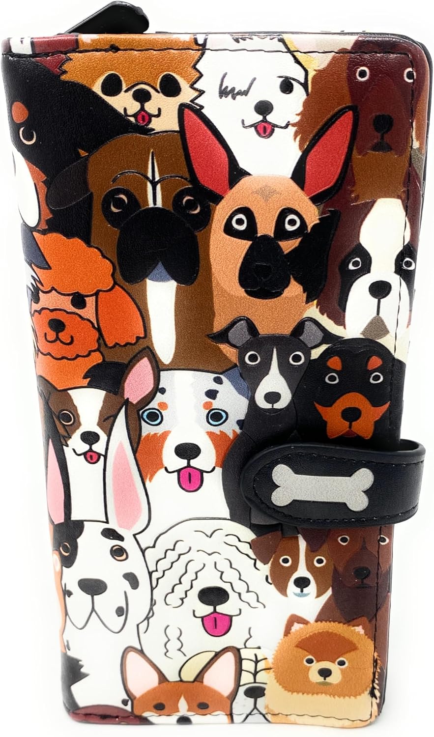 Shag Wear Doggie Crowd Large Wallet Vegan Faux Leather Dog Breed Design Clutch with Card Slots Bill Compartments ID Window Zippered Coin Pocket 7"