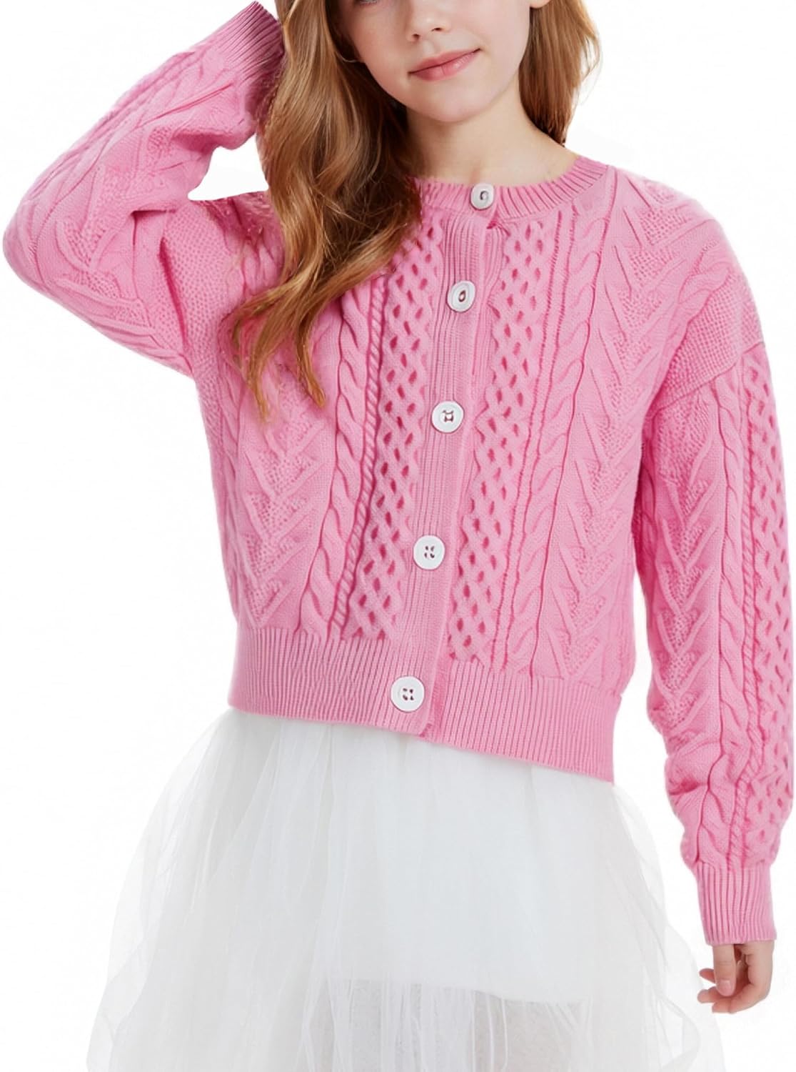 Girls Cardigan Long Sleeve Chunky Cable Knit Cardigan for Girls Button Front Uniform School Sweater 5-14Y