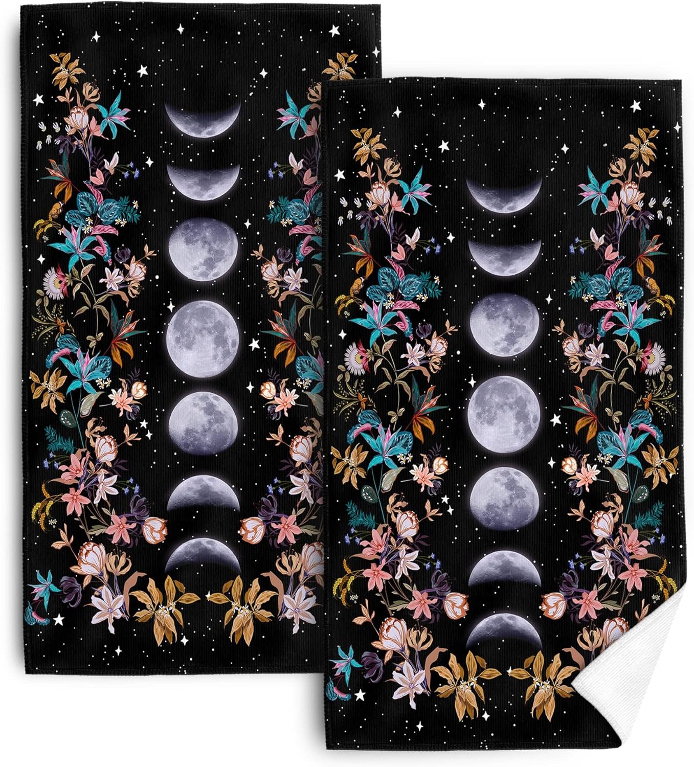 Witchy Black Kitchen Dish Towels Luna Moon Phases Boho Floral Botanic Hand Towel Gothic Bohemian Flower Decor Gifts 16"x24" Absorbent Drying Cloth Tea Towels Set of 2