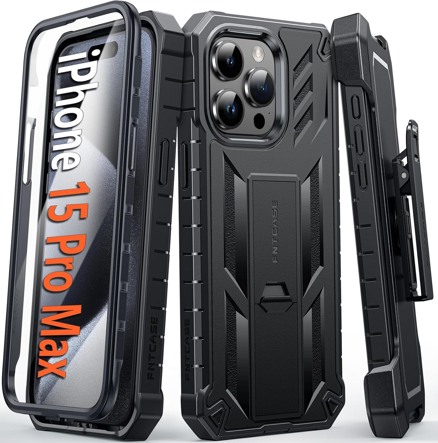 - FNTCASE ONLY for iPhone 15 Pro Max : Include iPhone 15 Pro Max Case with Built-in Kickstand *1, 360°Rotatable Belt-Clip *1, Phone Frame with Built-in Screen Protector *1