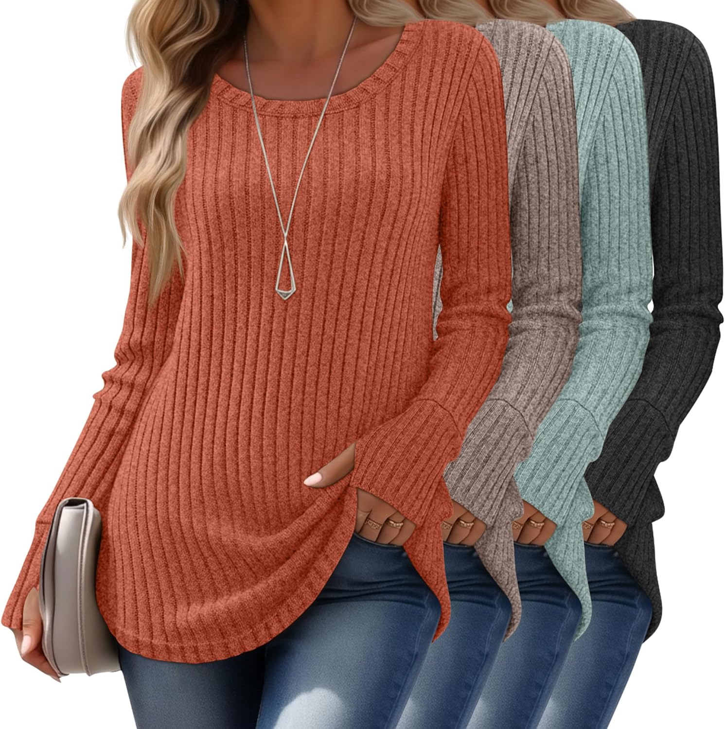 4 Pack Women's Long Sleeve Sweaters with Thumb Holes Crew Neck Tunic Tops Fall Loose Fit Shirts Ribbed Curved Hem