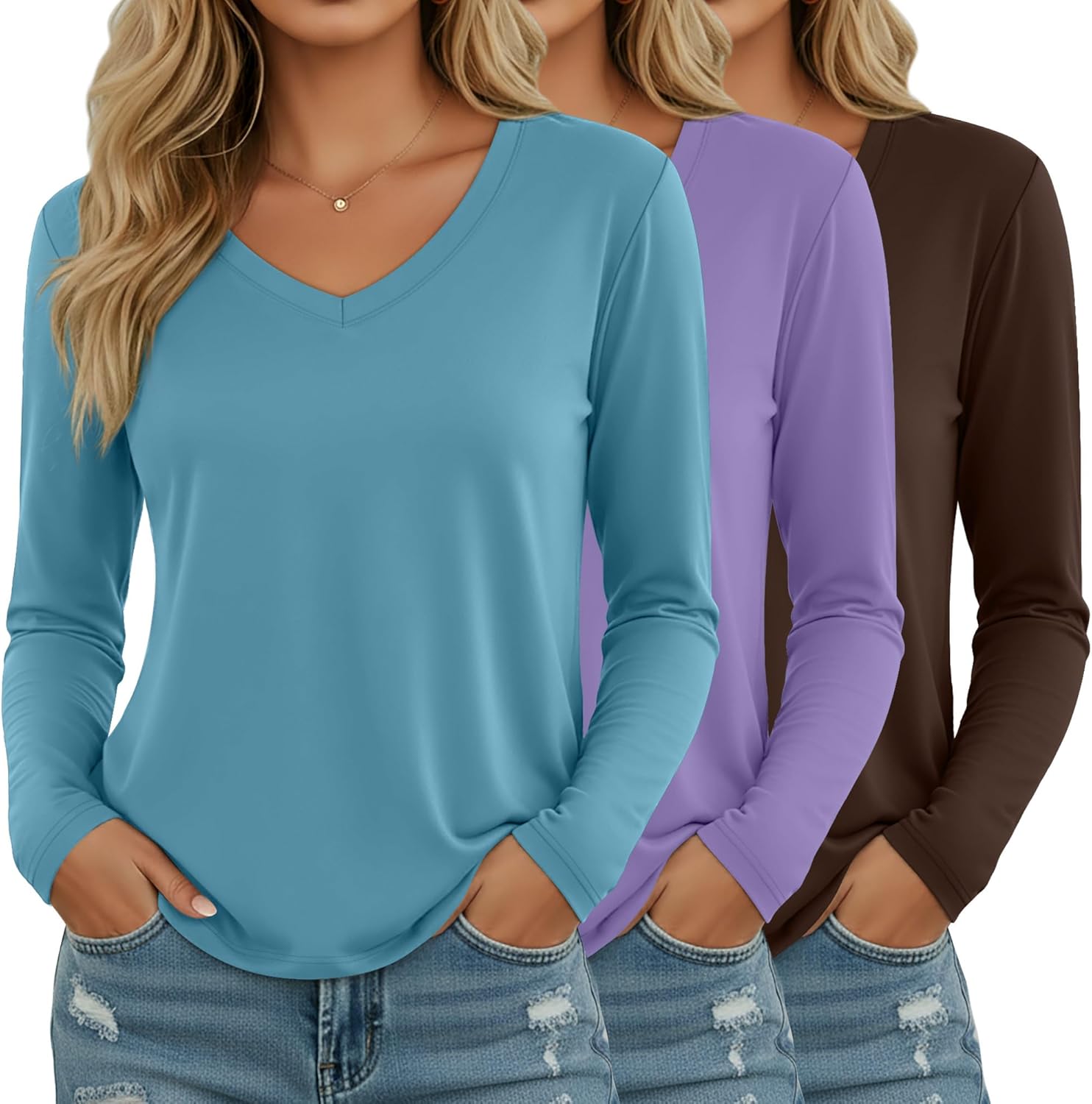Ficerd 3 Pack Women's Long Sleeve Shirts, V Neck Cotton Blend Tops Loose Fit Casual T-Shirts Curved Hem Basic Layering Tees
