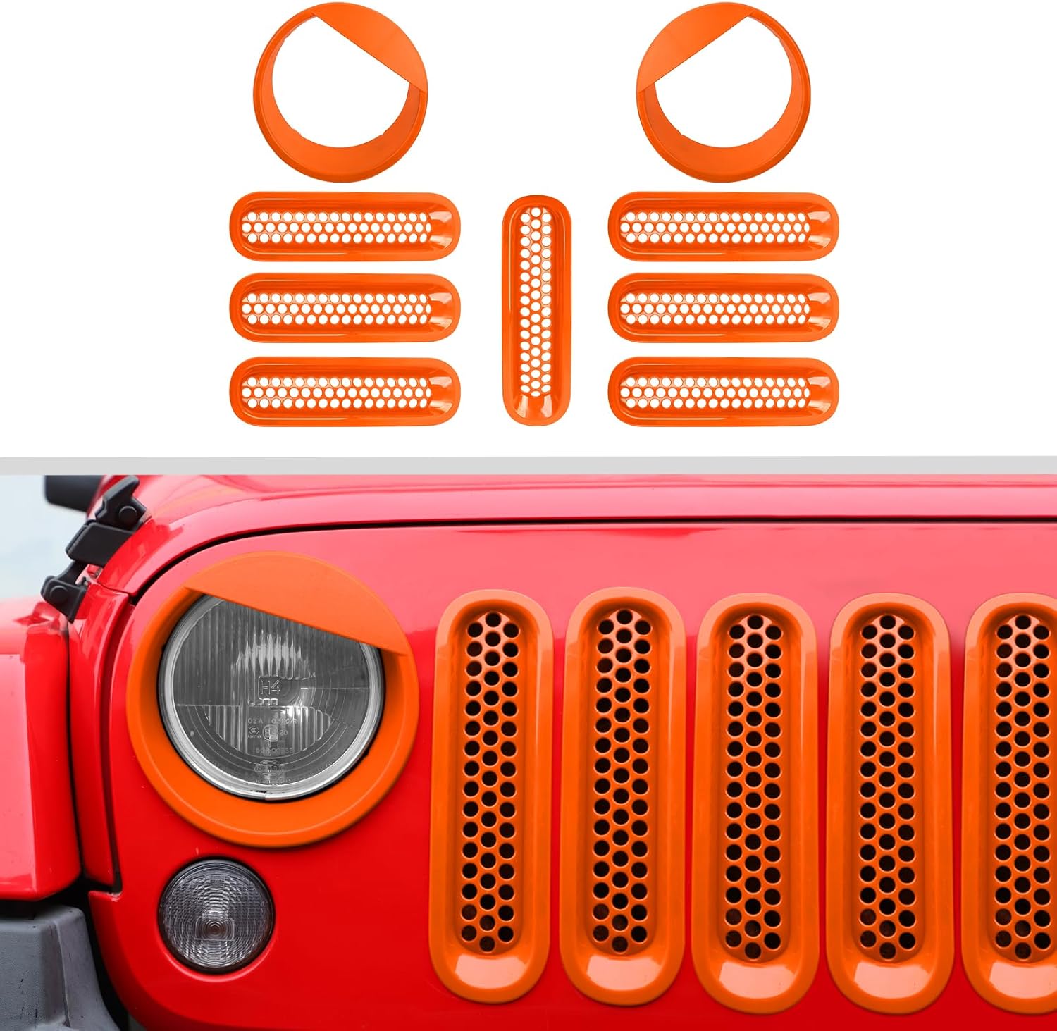 JWWY Front Grille Insert Radiator Grille Grillwork Surround Assembly Inserts Headlight Headlamp Cover Trim Set Fit for 2007-2017 Jeep Wrangler JK JKU Exterior Accessories 9pcs Orange